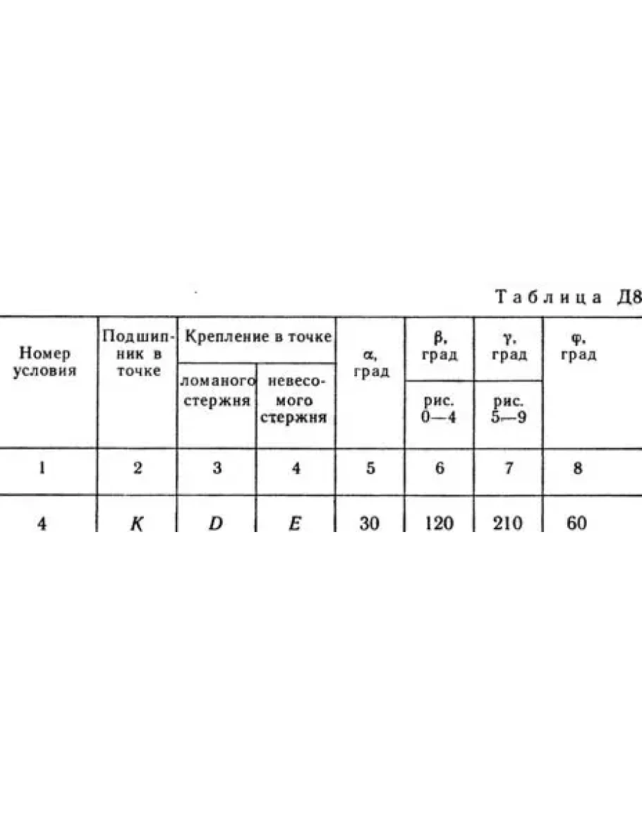 Вертикальный вал АК (рис. Д8.0 — Д8.9), вращающийся с постоянной угловой скоростью ω = 10 с-1, закреплен подпятником в точке A и цилиндрическим подшипником в точке, указанной в табл. Д8 в столбце 2 (АВ = BD = DE = ЕК = a). К валу жестко прикреплены тонкий однородный ломаный стержень массой m = 10 кг, состоящий из частей 1 и 2 (размеры частей стержня показаны на рисунках, где b = 0,1 м, а их массы m1 и m2 пропорциональны длинам), и невесомый стержень длиной l = 4b с точечной массой m3 = 3 кг на конце; оба стержня лежат в одной плоскости. Точки крепления стержней указаны в таблице в столбцах 3 и 4, а углы α, β, γ, φ даны в столбцах 5—8. Пренебрегая весом вала, определить реакции подпятника и подшипника. При подсчетах принять а = 0,6 м.