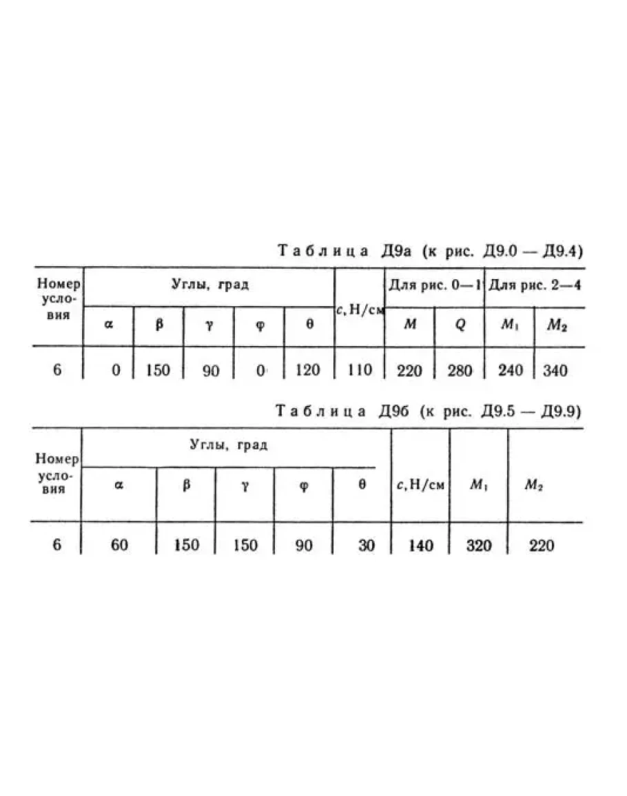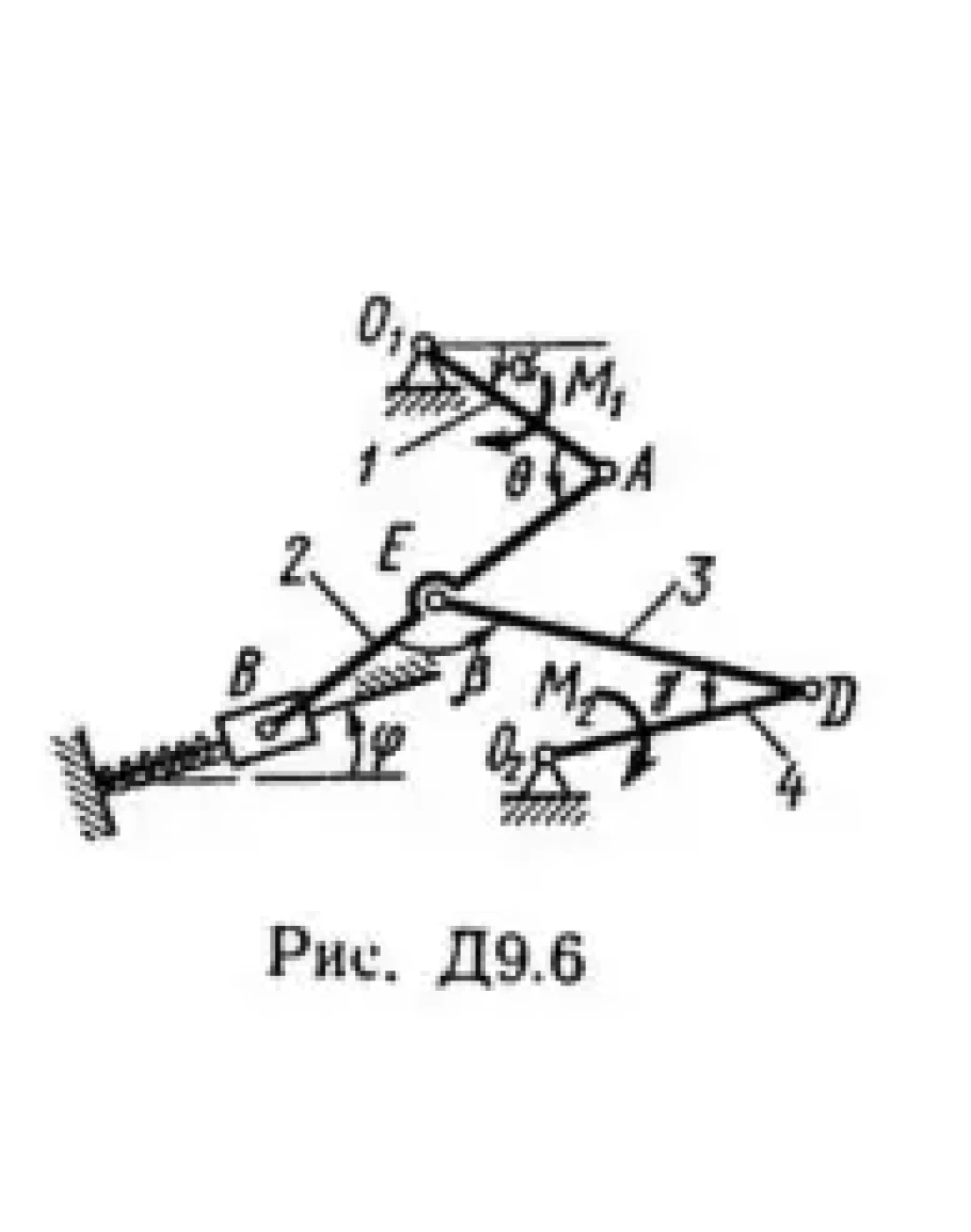 Механизм, расположенный в горизонтальной плоскости, находится под действием приложенных сил в равновесии; положение равновесия определяется углами α, β, γ, φ, θ (рис. Д9.0 — Д9.9, табл. Д9а и Д9б). Длины стержней механизма (кривошипов) равны: l1 = 0,4 м, l4 = 0,6 м (размеры l2 и l3 произвольны); точка Е находится в середине соответствующего стержня. На ползун В механизма действует сила упругости пружины F; численно F = сλ, где с — коэффициент жесткости пружины, λ — ее деформация. Кроме того, на рис. 0 и 1 на ползун D действует сила Q, а на кривошип O1А — пара сил с моментом М; на рис. 2—9 на кривошипы O1А и O2D действуют пары сил с моментами М1 и M2. Определить, чему равна при равновесии деформация λ пружины, и указать, растянута пружина или сжата. Значения всех заданных величин приведены в табл. Д9а для рис. 0—4 и в табл. Д9б для рис. 5—9, где Q выражено в ньютонах, а М, М1, М2 — в ньютонометрах. Построение чертежа начинать со стержня, направление которого определяется углом α; для большей наглядности ползун с направляющими и пружину изобразить так, как в примере Д9 (см. рис. Д9, а также рис. Д9.10, б). Если на чертеже решаемого варианта задачи прикрепленный к ползуну В стержень окажется совмещенным с пружиной (как на рис. Д9.10, а), то пружину следует считать прикрепленной к ползуну с другой стороны (как на рис. Д9.10, б, где одновременно иначе изображены направляющие).