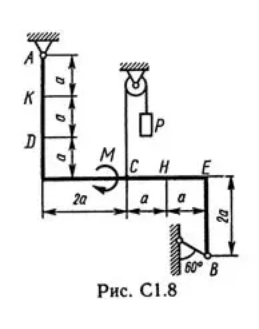Жесткая рама, расположенная в вертикальной плоскости (рис. С1.0 — С1.9, табл. С1), закреплена в точке А шарнирно, а в точке В прикреплена или к невесомому стержню с шарнирами на концах, или к шарнирной опоре на катках. В точке С к раме привязан трос, перекинутый через блок и несущий на конце груз весом Р = 25 кН. На раму действуют пара сил с моментом М = 100 кН·м и две силы, значения, направления и точки приложения которых указаны в таблице (например, в условиях № 1 на раму действует сила F2 под углом 15° к горизонтальной оси, приложенная в точке D и сила F3 под углом 60° к горизонтальной оси, приложенная в точке E, и т. д.). Определить реакции связей в точках A, В, вызываемые действующими нагрузками. При окончательных расчетах принять а = 0,5 м.