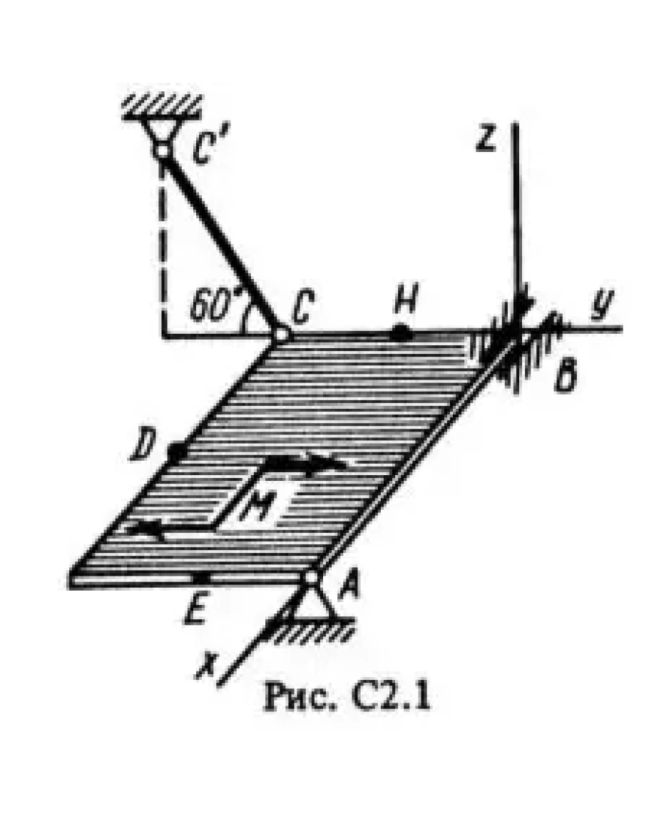 Однородная прямоугольная плита весом P = 5 кН со сторонами AB = 3l, BC = 2l закреплена в точке А сферическим шарниром (подшипником) и удерживается в равновесии невесомым стержнем CC' (рис. С2.0 – С2.9). На плиту действуют пара сил с моментом M = 6 кН·м, лежащая в плоскости плиты, и две силы. Значения этих сил, их направления и точки приложения указаны в табл. С2; при этом силы F1 и F4 лежат в плоскостях, параллельных плоскости xy, сила F2 – в плоскости, параллельной xz, сила F3 – в плоскости, параллельной yz. Точки приложения сил (D, E, H) находятся в серединах сторон плиты. Определить реакции связей в точках A, B и C. При подсчетах принять l = 0,8 м.