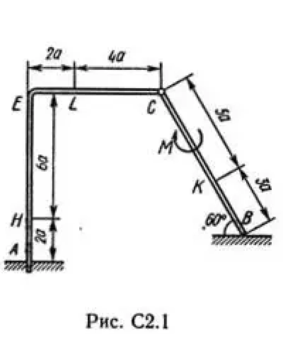 Конструкция состоит из жесткого угольника и стержня, которые в точке С или соединены друг с другом шарнирно (рис. С2.0 — С2.5), или свободно опираются друг о друга (рис. С2.6 — С2.9). Внешними связями, наложенными на конструкцию, являются в точке А или шарнир, или жесткая заделка; в точке В или гладкая плоскость (рис. 0 и 1), или невесомый стержень ВВ' (рис. 2 и 3), или шарнир (рис. 4—9); в точке D или невесомый стержень DD' (рис. 0, 3, 8), или шарнирная опора на катках (рис. 7). На каждую конструкцию действуют: пара сил с моментом М = 60 кН·м, равномерно распределенная нагрузка интенсивности q = 20 кН/м и еще две силы. Эти силы, их направления и точки приложения указаны в табл. С2; там же в столбце «Нагруженный участок» указано, на каком участке действует распределенная нагрузка (например, в условиях № 1 на конструкцию действуют сила F2 под углом 60° к горизонтальной оси, приложенная в точке L, сила F4 под углом 30° к горизонтальной оси, приложенная в точке Е, и нагрузка, распределенная на участке СK). Определить реакции связей в точках А, В, С (для рис. 0, 3, 7, 8 еще и в точке D), вызванные заданными нагрузками. При окончательных расчетах принять а = 0,2 м.
