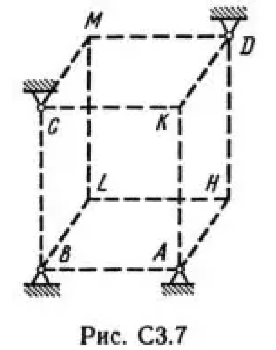 Шесть невесомых стержней соединены своими концами шарнирно друг с другом в двух узлах и прикреплены другими концами (тоже шарнирно) к неподвижным опорам А, В, С, D (рис. СЗ.0 — С3.9, табл. СЗ). Стержни и узлы (узлы расположены в вершинах H, К, L или М прямоугольного параллелепипеда) на рисунках не показаны и должны быть изображены решающим задачу по данным таблицы. В узле, который в каждом столбце таблицы указан первым, приложена сила Р = 200 Н; во втором узле приложена сила Q = 100 Н. Сила Р образует с положительными направлениями координатных осей х, у, z углы, равные соответственно α1 = 45°, β1 = 60°, γ1 = 60°, а сила Q — углы α2 = 60°, β2 = 45°, γ2 = 60°; направления осей х, у, z для всех рисунков показаны на рис. СЗ.0. Грани параллелепипеда, параллельные плоскости ху, — квадраты. Диагонали других боковых граней образуют с плоскостью ху угол φ = 60°, а диагональ параллелепипеда образует с этой плоскостью угол θ = 51°. Определить усилия в стержнях. На рис. С3.10 в качестве примера показано, как должен выглядеть чертеж СЗ. 1, если по условиям задачи узлы находятся в точках L и М, а стержнями являются LM, LA, LB; МА, МС, MD. Там же показаны углы φ и θ.