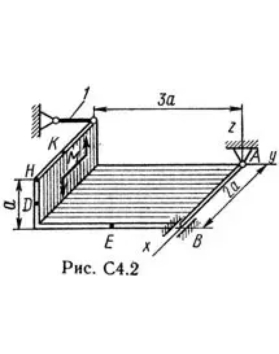 Две однородные прямоугольные тонкие плиты жестко соединены (сварены) под прямым углом друг к другу и закреплены сферическим шарниром (или подпятником) в точке А, цилиндрическим шарниром (подшипником) в точке В и невесомым стержнем 1 (рис. С4.0 — С4.7) или же двумя подшипниками в точках A и В и двумя невесомыми стержнями 1 и 2 (рис. С4.8, С4.9); все стержни прикреплены к плитам и к неподвижным опорам шарнирами. Размеры плит указаны на рисунках; вес большей плиты P1 = 5 кН, вес меньшей плиты P2 = 3 кН. Каждая из плит расположена параллельно одной из координатных плоскостей (плоскость ху — горизонтальная). На плиты действуют пара сил с моментом М = 4 кН·м, лежащая в плоскости одной из плит, и две силы. Значения этих сил, их направления и точки приложения указаны в табл. С4; при этом силы F1 и F4 лежат в плоскостях, параллельных плоскости ху, сила F2 — в плоскости, параллельной xz, и сила F3 — в плоскости, параллельной yz. Точки приложения сил (D, Е, Н, К) находятся в углах или в серединах сторон плит. Определить реакции связей в точках А и В и реакцию стержня (стержней). При подсчетах принять а = 0,6 м.