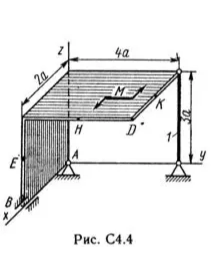 Две однородные прямоугольные тонкие плиты жестко соединены (сварены) под прямым углом друг к другу и закреплены сферическим шарниром (или подпятником) в точке А, цилиндрическим шарниром (подшипником) в точке В и невесомым стержнем 1 (рис. С4.0 — С4.7) или же двумя подшипниками в точках A и В и двумя невесомыми стержнями 1 и 2 (рис. С4.8, С4.9); все стержни прикреплены к плитам и к неподвижным опорам шарнирами. Размеры плит указаны на рисунках; вес большей плиты P1 = 5 кН, вес меньшей плиты P2 = 3 кН. Каждая из плит расположена параллельно одной из координатных плоскостей (плоскость ху — горизонтальная). На плиты действуют пара сил с моментом М = 4 кН·м, лежащая в плоскости одной из плит, и две силы. Значения этих сил, их направления и точки приложения указаны в табл. С4; при этом силы F1 и F4 лежат в плоскостях, параллельных плоскости ху, сила F2 — в плоскости, параллельной xz, и сила F3 — в плоскости, параллельной yz. Точки приложения сил (D, Е, Н, К) находятся в углах или в серединах сторон плит. Определить реакции связей в точках А и В и реакцию стержня (стержней). При подсчетах принять а = 0,6 м.