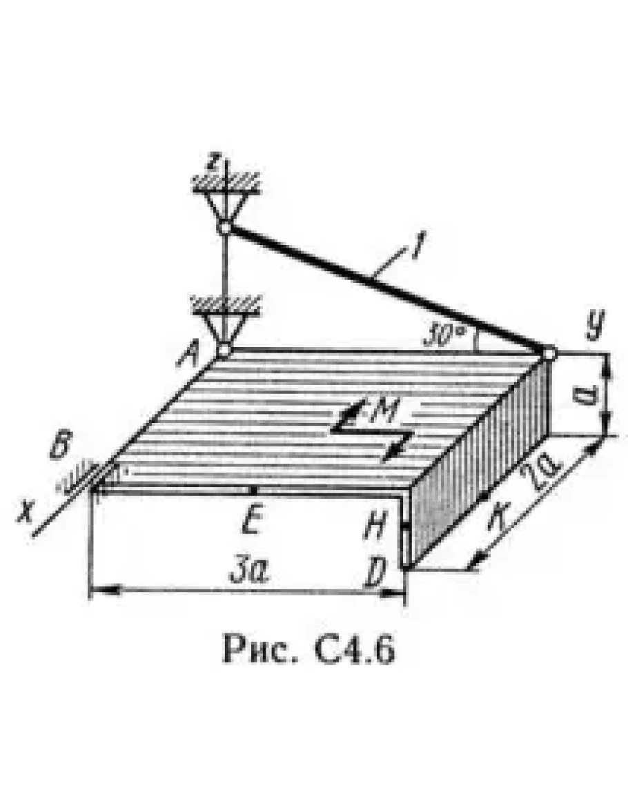 Две однородные прямоугольные тонкие плиты жестко соединены (сварены) под прямым углом друг к другу и закреплены сферическим шарниром (или подпятником) в точке А, цилиндрическим шарниром (подшипником) в точке В и невесомым стержнем 1 (рис. С4.0 — С4.7) или же двумя подшипниками в точках A и В и двумя невесомыми стержнями 1 и 2 (рис. С4.8, С4.9); все стержни прикреплены к плитам и к неподвижным опорам шарнирами. Размеры плит указаны на рисунках; вес большей плиты P1 = 5 кН, вес меньшей плиты P2 = 3 кН. Каждая из плит расположена параллельно одной из координатных плоскостей (плоскость ху — горизонтальная). На плиты действуют пара сил с моментом М = 4 кН·м, лежащая в плоскости одной из плит, и две силы. Значения этих сил, их направления и точки приложения указаны в табл. С4; при этом силы F1 и F4 лежат в плоскостях, параллельных плоскости ху, сила F2 — в плоскости, параллельной xz, и сила F3 — в плоскости, параллельной yz. Точки приложения сил (D, Е, Н, К) находятся в углах или в серединах сторон плит. Определить реакции связей в точках А и В и реакцию стержня (стержней). При подсчетах принять а = 0,6 м.