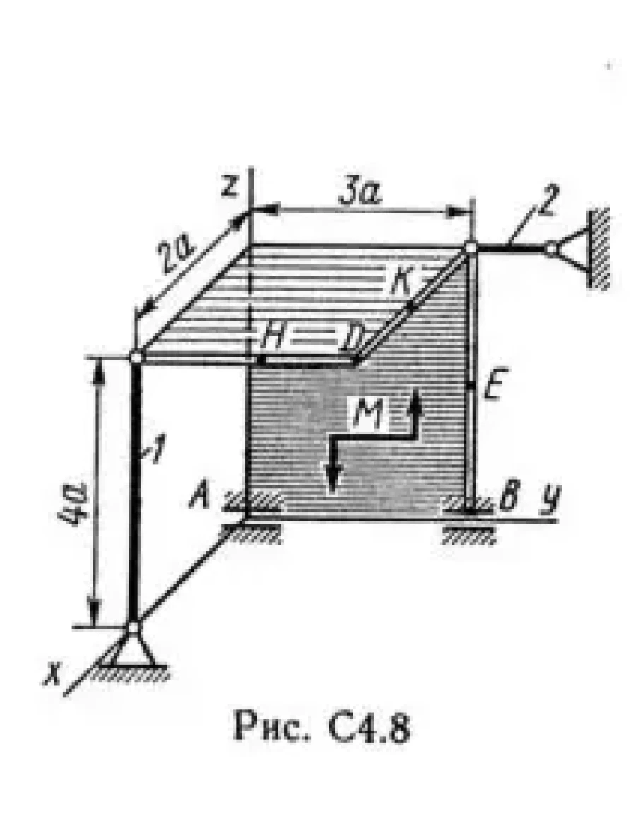 Две однородные прямоугольные тонкие плиты жестко соединены (сварены) под прямым углом друг к другу и закреплены сферическим шарниром (или подпятником) в точке А, цилиндрическим шарниром (подшипником) в точке В и невесомым стержнем 1 (рис. С4.0 — С4.7) или же двумя подшипниками в точках A и В и двумя невесомыми стержнями 1 и 2 (рис. С4.8, С4.9); все стержни прикреплены к плитам и к неподвижным опорам шарнирами. Размеры плит указаны на рисунках; вес большей плиты P1 = 5 кН, вес меньшей плиты P2 = 3 кН. Каждая из плит расположена параллельно одной из координатных плоскостей (плоскость ху — горизонтальная). На плиты действуют пара сил с моментом М = 4 кН·м, лежащая в плоскости одной из плит, и две силы. Значения этих сил, их направления и точки приложения указаны в табл. С4; при этом силы F1 и F4 лежат в плоскостях, параллельных плоскости ху, сила F2 — в плоскости, параллельной xz, и сила F3 — в плоскости, параллельной yz. Точки приложения сил (D, Е, Н, К) находятся в углах или в серединах сторон плит. Определить реакции связей в точках А и В и реакцию стержня (стержней). При подсчетах принять а = 0,6 м.