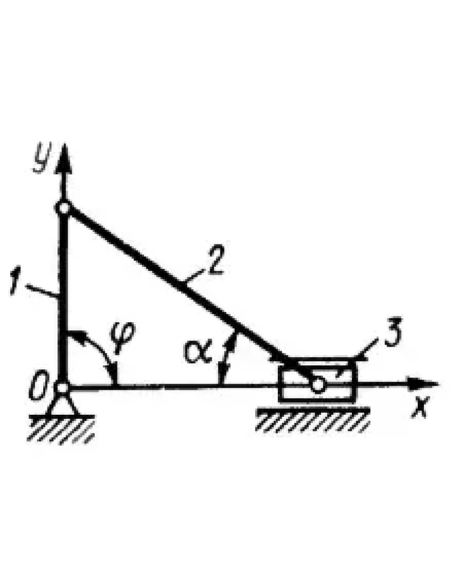 Определить координату хс центра масс кривошипно-ползунного механизма при углах ? = 90о и ? = 30°, если масса кривошипа 1 равна 4 кг, а масса шатуна 2 равна 8 кг. Шатун 2 длиной 0,8 м считать однородным стержнем. Массой ползуна 3 пренебречь. (Ответ 0,231)