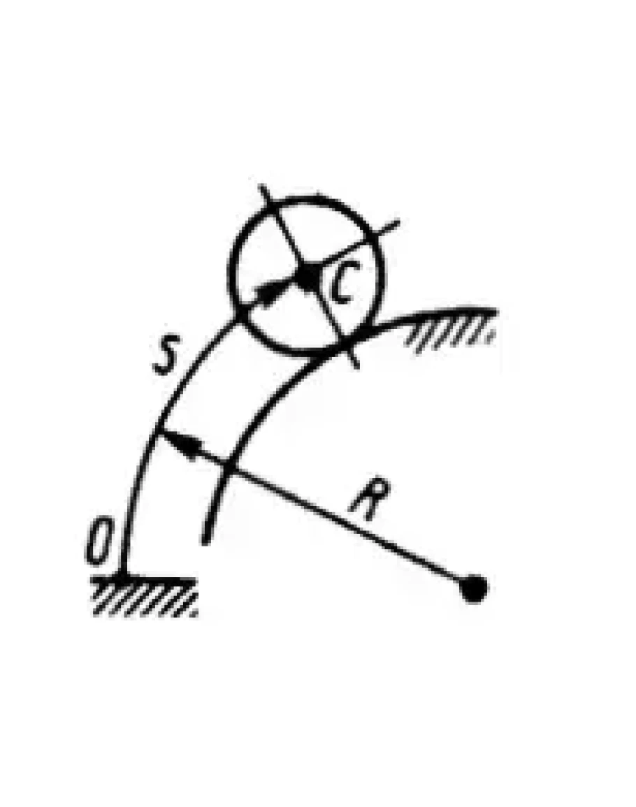 Центр масс колеса С движется по окружности радиуса R = 1,3 м согласно закону s = 4t.