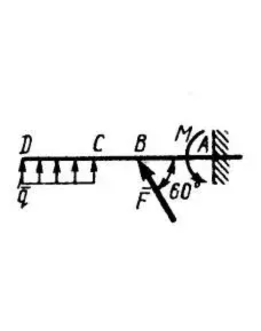 Определить интенсивность q распределенной нагрузки, при которой момент в заделке А равен 546 Н·м, если сила F = 173 Н, момент пары сил М = 42 Н·м, размеры АВ = СD = 2м, ВС= 1 м. (Ответ 36,0)
