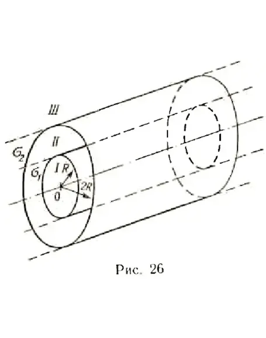 330. На двух коаксиальных бесконечных цилиндрах радиусами R и 2R равномерно распределены заряды с поверхностными плотностями σ1 и σ2 (рис. 26). Требуется: 1) используя теорему Остроградского-Гаусса: найти зависимость E(r) напряженности электрического поля от расстояния для трех областей: I, II и III. Принять σ1 = -σ, σ2 = 4σ; 2) вычислить напряженность Е в точке, удаленной от оси цилиндров на расстояние r, и указать направление вектора Е. Принять σ = 30 нКл/м2, r = 4R; 3) построить график E(r).