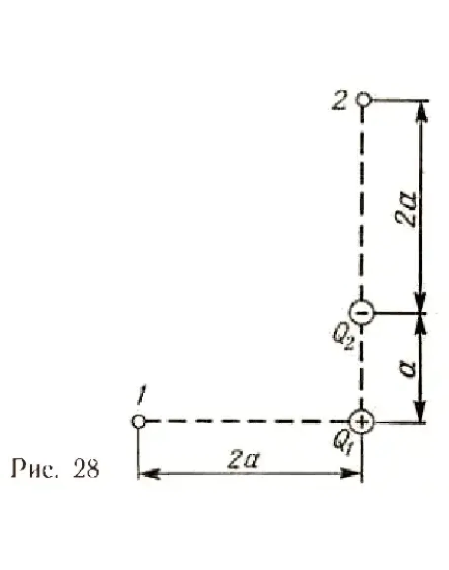 333. Электрическое поле создано зарядами Q1 = 2 мкКл и Q2 = -2 мкКл, находящимися на расстоянии a = 10 см друг от друга, определить работу сил поля, совершаемую при перемещении заряда Q = 0,5 мкКл из точки 1 в точку 2 (рис. 28).