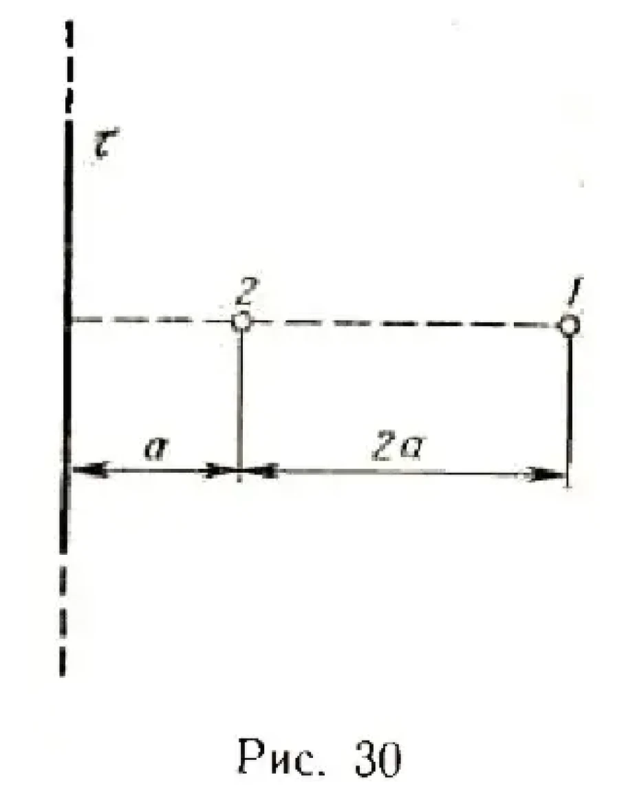 349. Электрическое поле создано бесконечной заряженной прямой линией с равномерно распределенным зарядом (τ = 10 нКл/м). Определить кинетическую энергию T2 электрона в точке 2, если в точке 1 его кинетическая энергия T1 = 200 эВ (рис. 30).