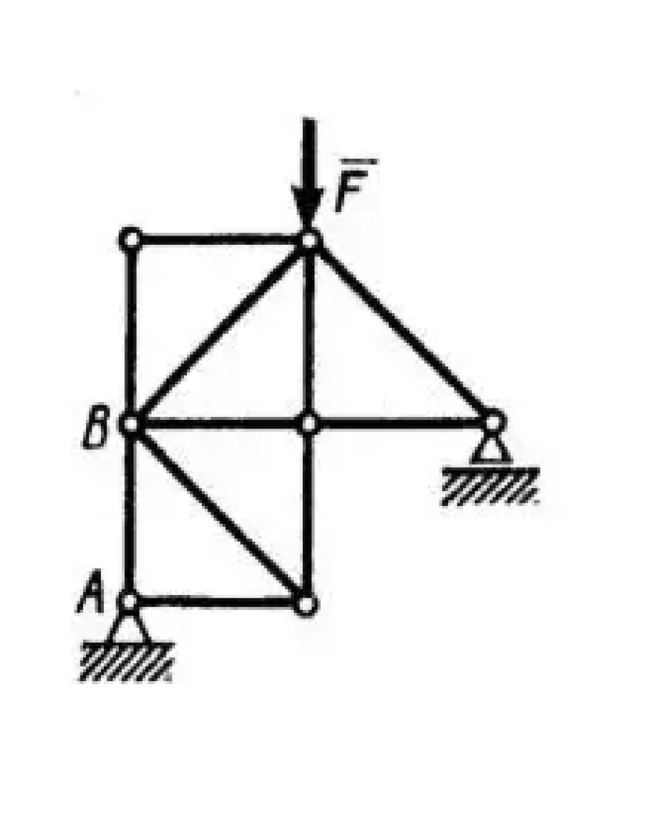 Определить усилие в стержне АВ. Сила F = 600Н, а длины всех горизонтальных и вертикальных стержней равны между собой. (Ответ 300)