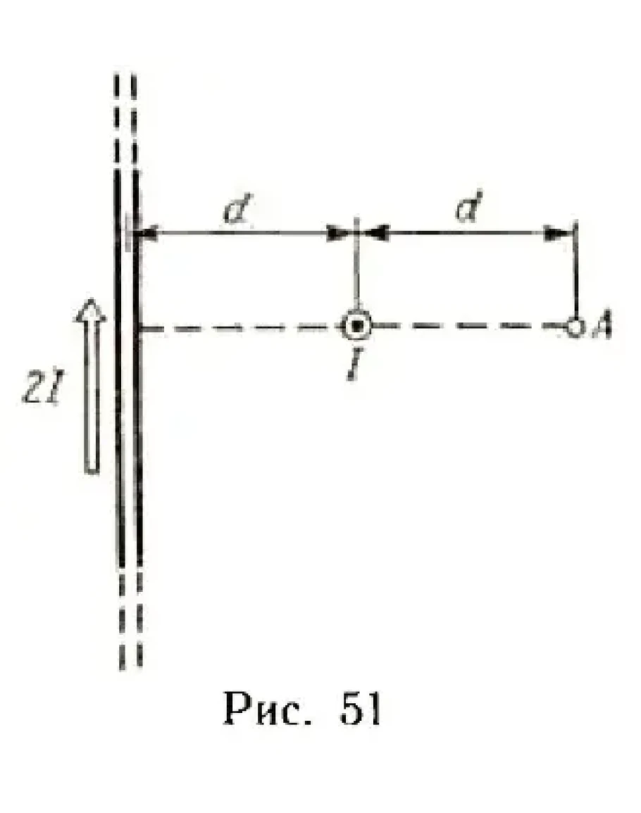 403. По двум скрещенным под прямым углом бесконечно длинным проводам текут токи I и 2I (I = 100 А). Определить магнитную индукцию B в точке А (рис.51). Расстояние d = 10 см.