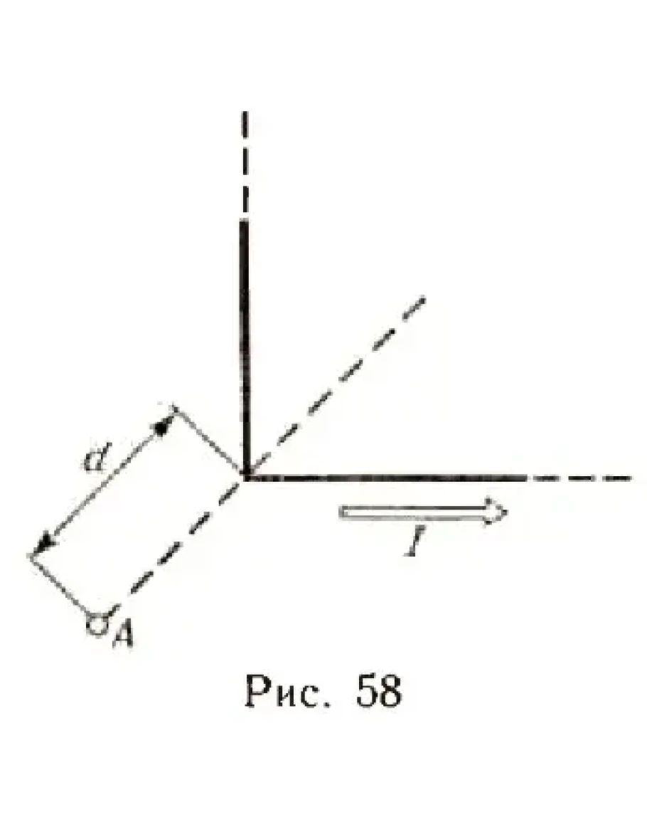 410. Бесконечно длинный провод с током I = 50 А изогнут так, как это показано на рис.58. Определить магнитную индукцию B в точке A, лежащей на биссектрисе прямого угла на расстоянии d = 10 cм от его вершины.