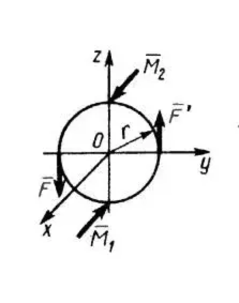 Две пары сил с моментами М1 = 24 Н·м и М2 = 12 Н·м уравновешены третьей парой сил (F,F'), действующей в плоскости Oyz. Векторы М1 и М2 параллельны оси Ох. Определить модуль силы F если радиус r = 1м. (Ответ 6)