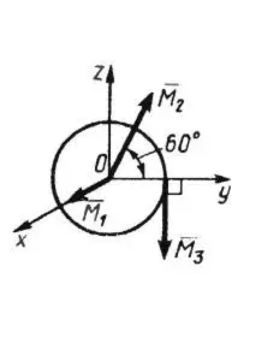 Определить модуль момента равнодействующей пары сил для системы трех пар сил с моментами М1=2 Н·м, М2 = М3 = 3 Н·м. Векторы М2 и М3 расположены в плоскости Oyz, а М1 || Ох (Ответ 2,53)