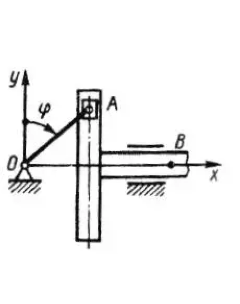 Определить ускорение точки В в момент времени t = 5 с, если длина кривошипа ОА = 15 см, а закон изменения угла ? = 4t. (Ответ -2,19)