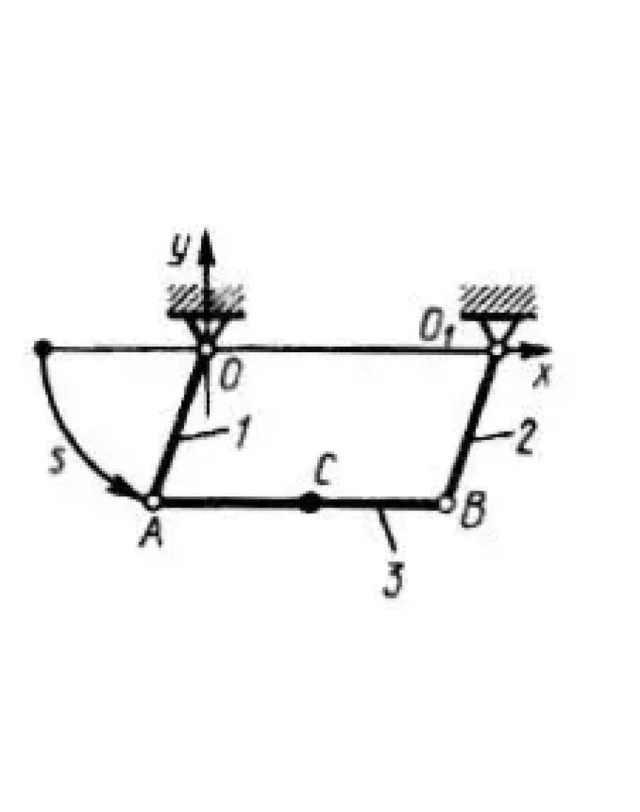 На двух кривошипах 1 и 2 одинаковой длины ОА = O1B = 0,2 м закреплен стержень совершающий движение в плоскости Оху. Точка А движется по закону s = 0,2 ?t. Определить ускорение средней точки С стержня при t = 0, если АВ = 0,36 м. (Ответ 1,97)
