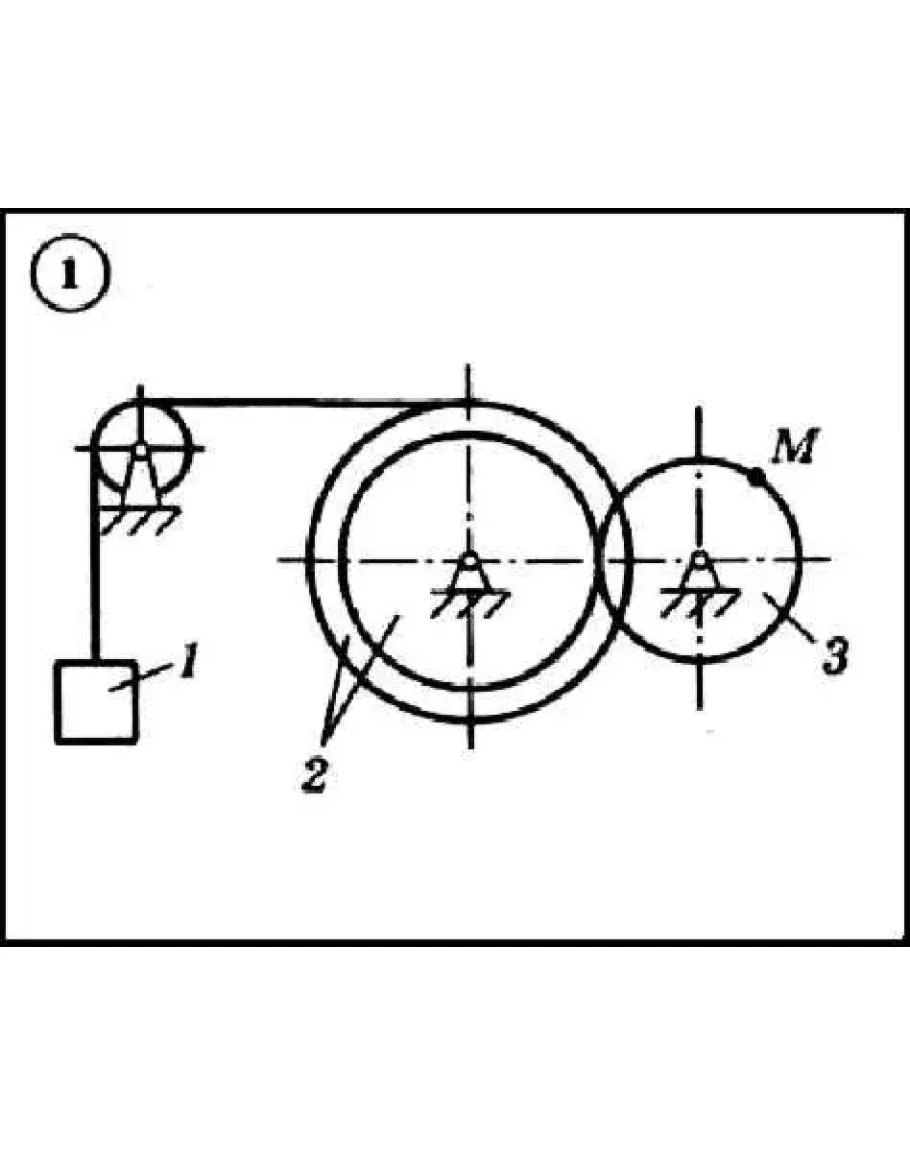 Для приведенной ниже схемы механизма по известным характеристикам груза 1 - скорости v1x и ускорению a1x определить и показать на рисунке скорость и ускорение точки М, а также скорость и ускорение груза 1 в данный момент времени. Исходные данные, включая радиусы шестерен, шкивов и барабанов, приведены в таблице.