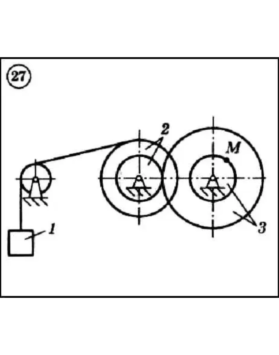 Для приведенной ниже схемы механизма по заданному уравнению движения тела 1 - x(t) определить и показать на рисунке скорость и ускорение точки М, а также скорость и ускорение груза 1 в данный момент времени. Исходные данные, включая радиусы шестерен, шкивов и барабанов, приведены в таблице.