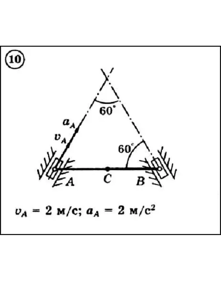 Для приведенного на схеме механизма, состоящего из шатуна AB длиной 2 м и двух ползунов, по заданным величинам скорости и ускорения ползуна A определить скорость и ускорение ползуна B и средней точки C шатуна, а также угловую скорость и угловое ускорение шатуна