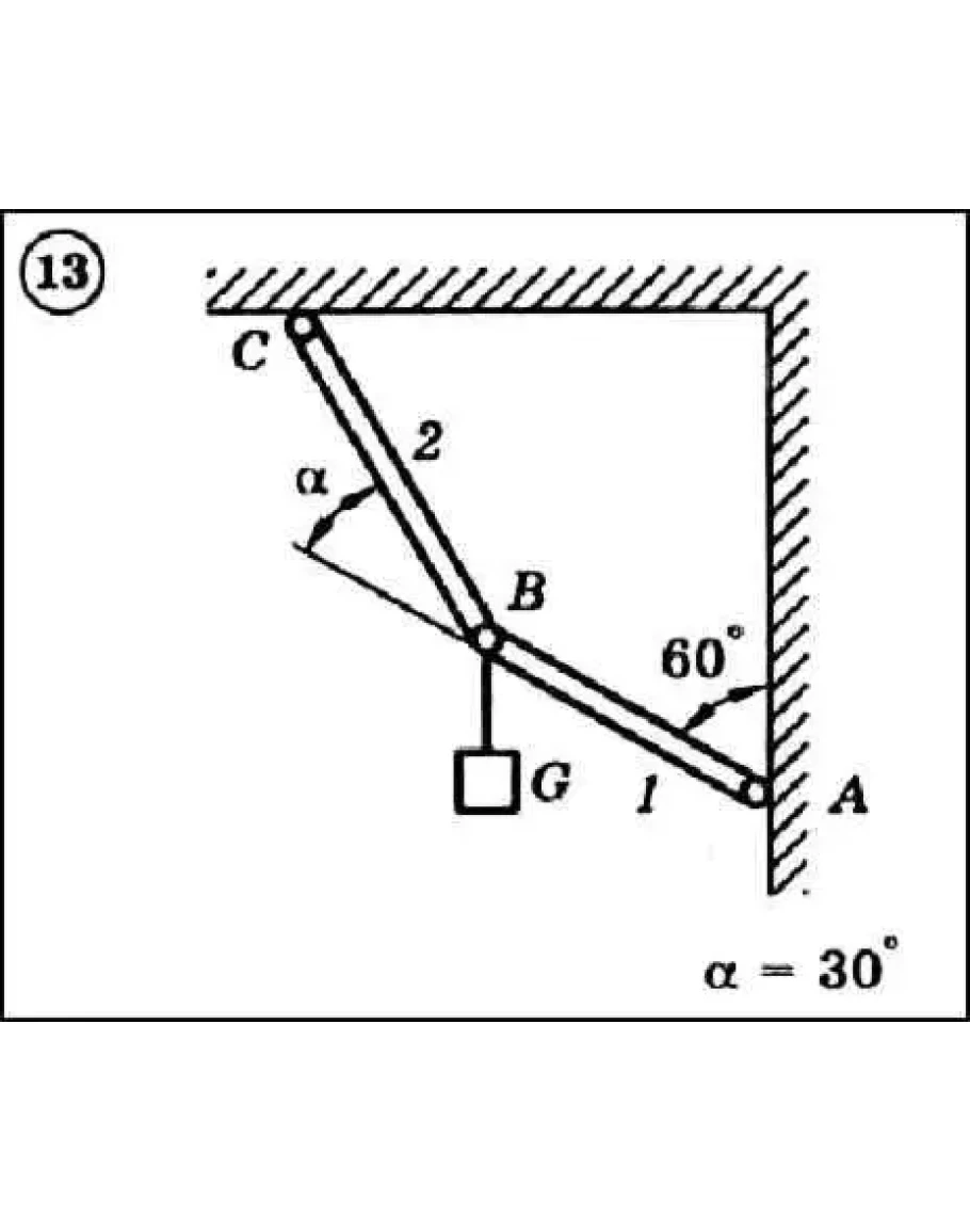 Для представленной на рисунке механической системы найти усилия в опорных стержнях 1 и 2. Вес груза G = 10кН, стержни, блоки и тросы невесомы