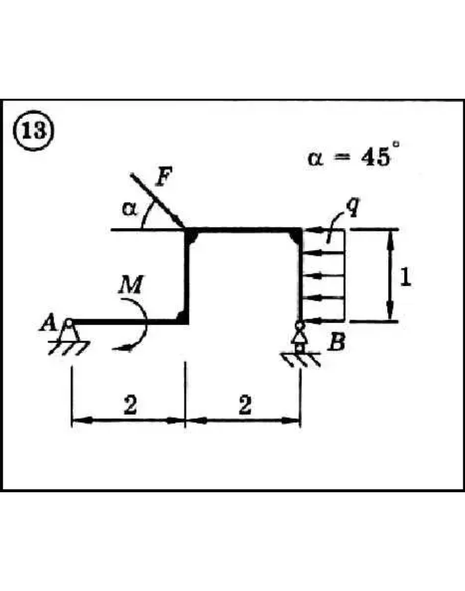 Для представленного на схеме тела определить реакции опор. Приведенные на схеме нагрузки имеют следующие величины: вес груза G = 10 кН, сила F = 10кН, момент пары сил М = 20 кНм, интенсивность распределенной силы q = 5 кН/м, а также qmax = 5 кН/м. Размеры указаны в метрах. Весом тела следует пренебречь.