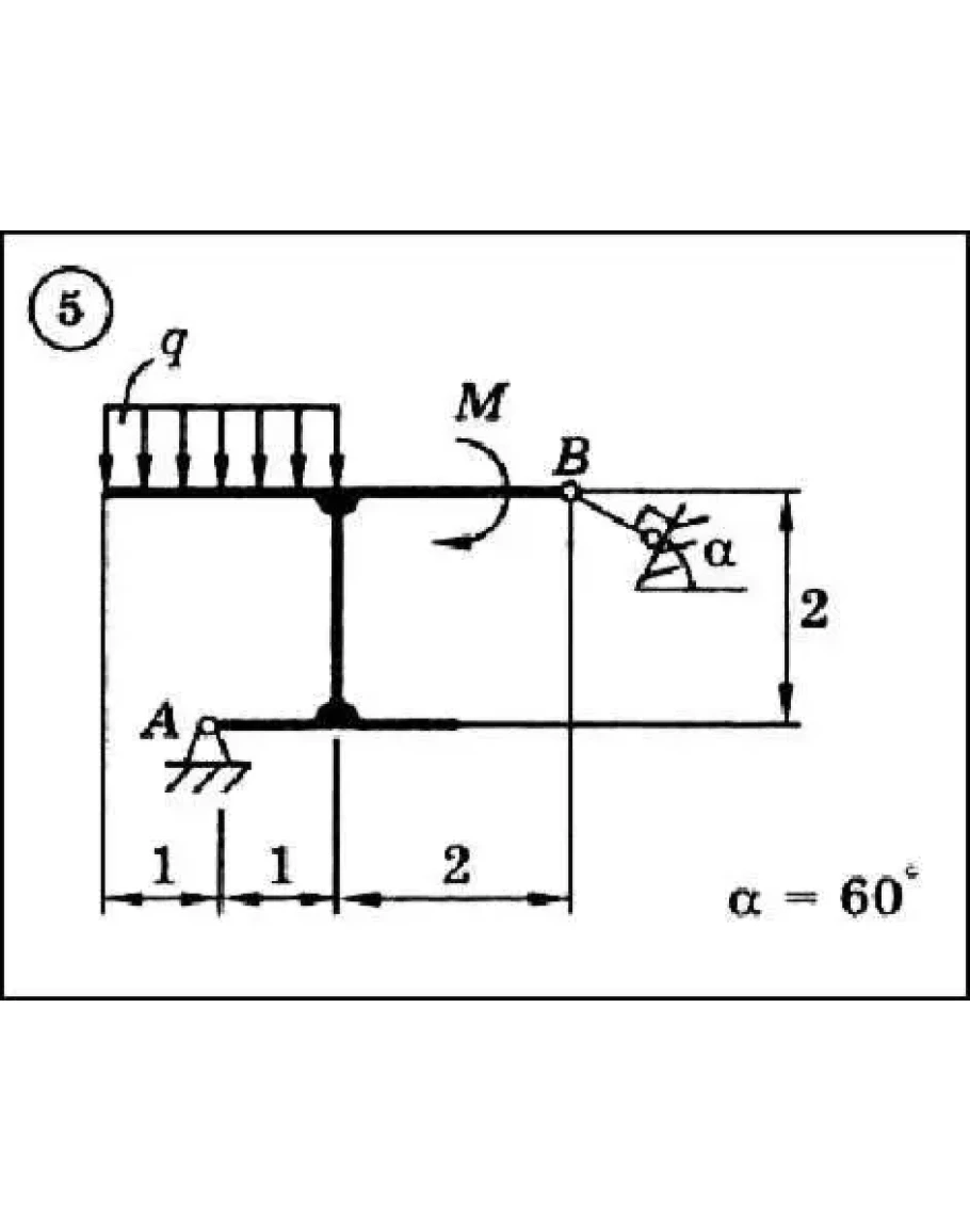 Для представленного на схеме тела определить реакции опор. Приведенные на схеме нагрузки имеют следующие величины: вес груза G = 10 кН, сила F = 10кН, момент пары сил М = 20 кНм, интенсивность распределенной силы q = 5 кН/м, а также qmax = 5 кН/м. Размеры указаны в метрах. Весом тела следует пренебречь.