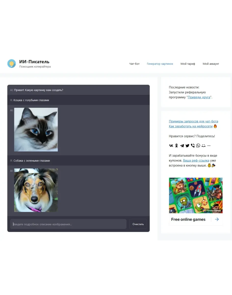 - Наш тариф предоставляет доступ к чат-боту генератору картинок и текстов на 1 день + 1,5 coins.