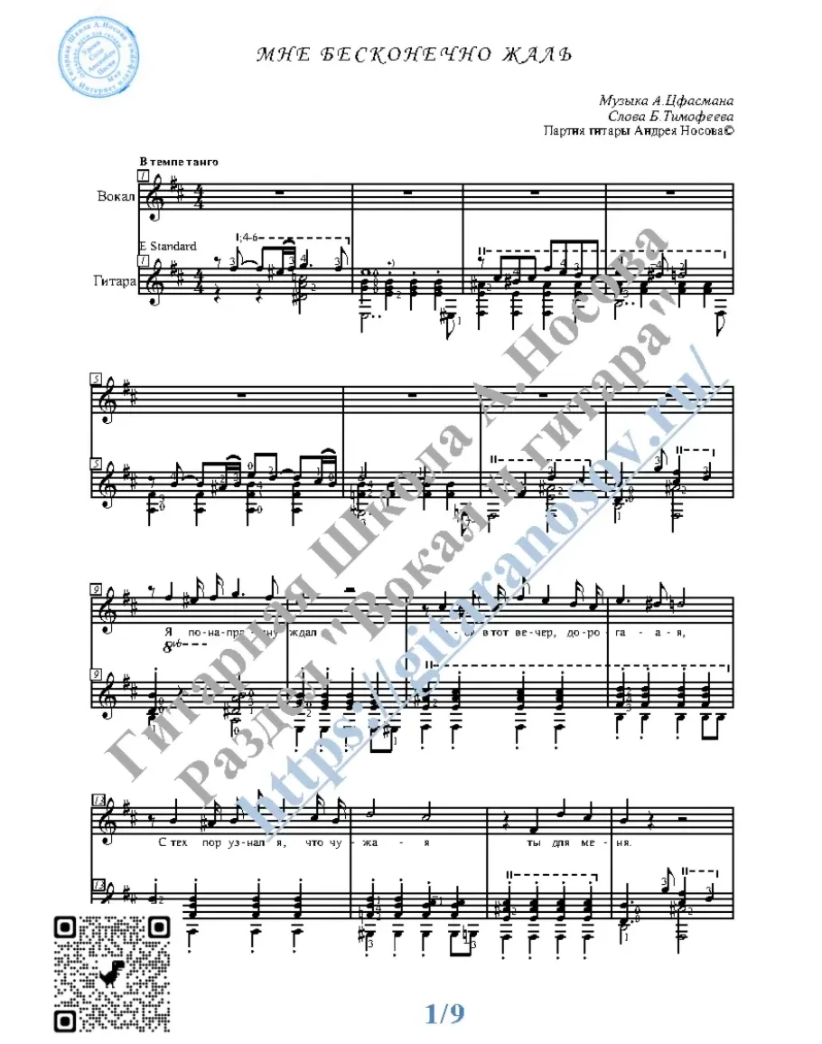 Кликните "Подробнее" для получения дополнительной информацииВашему вниманию предлагается композиция "Мне бесконечно жаль (муз.А.Цфасмана, сл..Б.Тимофеева)", предназначенная для вокала в сопровождении 6-ти струнной гитары. Запись выполнена нотами и включает в себя партию вокала с подтекстовкой, партию гитары с подробнейшей аппликатурой и текст песни (НА РУССКОМ).