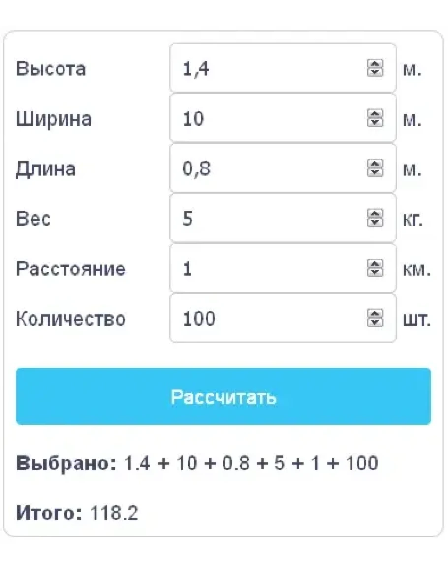 Калькулятор состоит из нескольких числовых полей ввода и кнопки «Рассчитать». Вводимыми значениями, могут быть как целые, так и дробные числа. Шаг изменения числа, тип числа, максимально и минимально допустимые значения задаются для каждого поля индивидуально. Единицами ввода и расчета, могут быть различные величины. Например, можно вводить: длину, ширину, высоту, вес, расстояние, количество, площадь, объем и т.д.