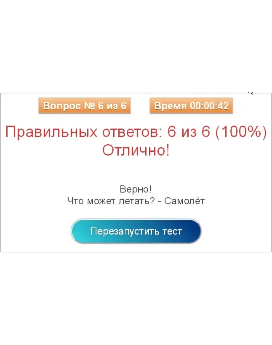 В процессе прохождения теста подсчитывается количество правильных ответов, % правильных ответов и по окончании выдается соответствующая оценка «Плохо/Удовлетворительно/Хорошо/Отлично»