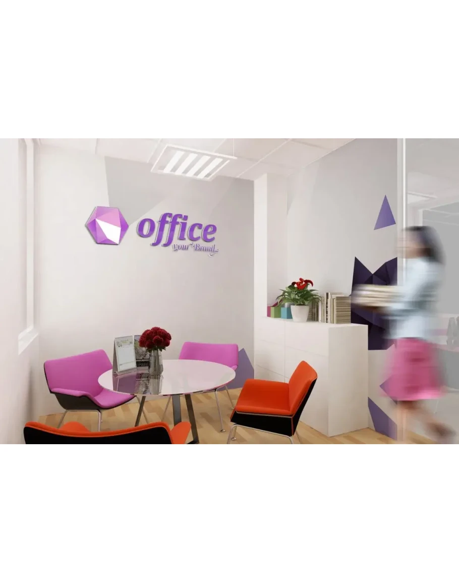 Living room (the presentation artwork on the wall, 3d logo, on the glass)