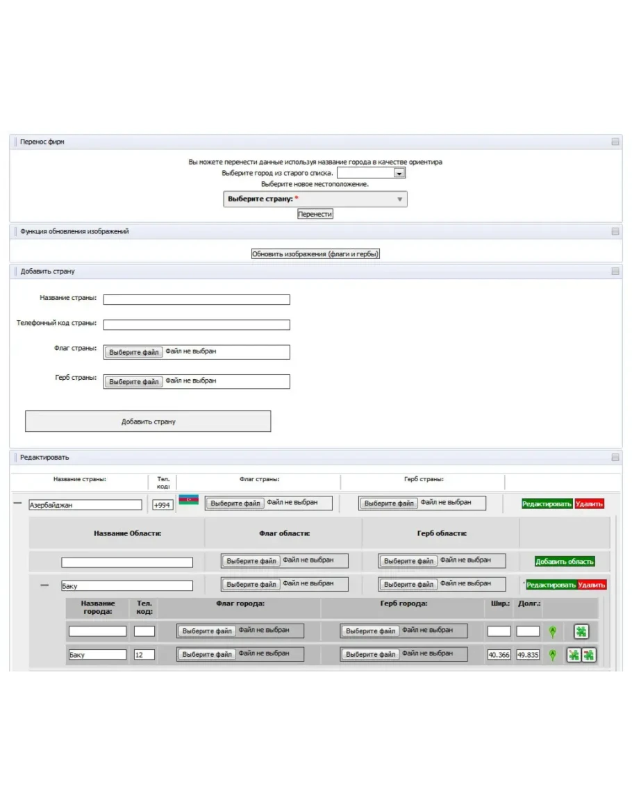 При добавлении города есть возможность добавить Название города, телефонный код, флаг, герб, а также указать ширину и долготу, в частности с помощью API yandex.map.