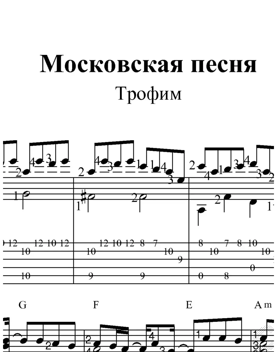 Ноты для одной гитары с аппликатурой левой руки и табы к переложению "Московской песни" Сергея Трофимова. Ноты продублированные табулатурой в формате pdf и файл в формате GP5