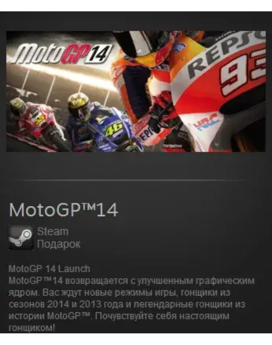Выезжайте на трассу - вас ждут все гонщики из сезонов 2013 и 2014 года, а также легендарные чемпионы из истории MotoGP™. Проедьте по всем официальным трассам и сразитесь с соперниками на совершенно новом треке в Аргентине. Испытайте свое мастерство в новых режимах - таких как Split Battle и Real Events 2013, и не забудьте о режиме карьеры. MotoGP™14 была значительно переработана благодаря новому графическому ядру. Теперь у игроков появилась возможность ощутить себя настоящими гонщиками MotoGP™.