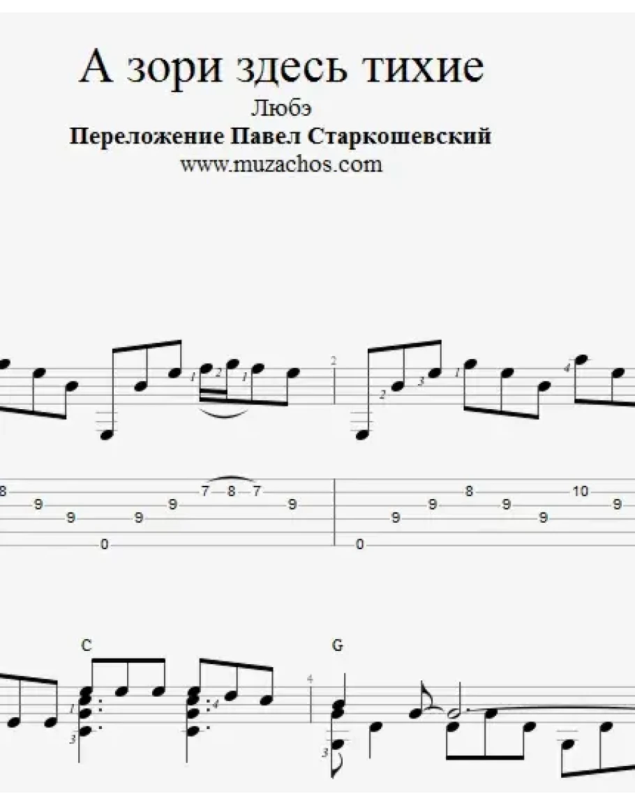 Ноты для одной гитары с аппликатурой левой руки и табулатура к переложению песни Любэ "А зори здесь тихие" Формат: tiff, pdf, guitar pro 6