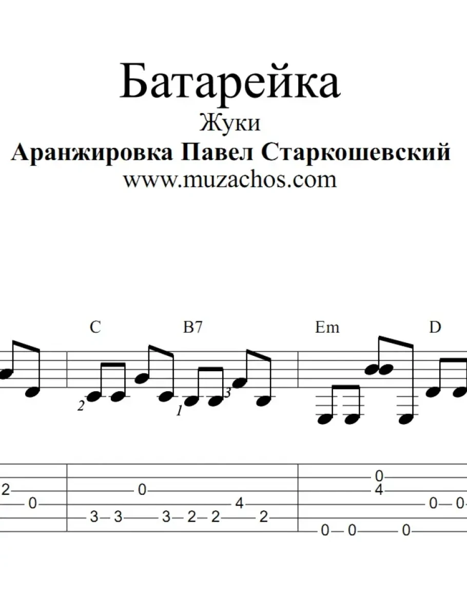 Ноты для одной гитары с аппликатурой левой руки и табулатура к переложению песни группы Жуки "Батарейка". Форматы: pdf, guitar pro 6