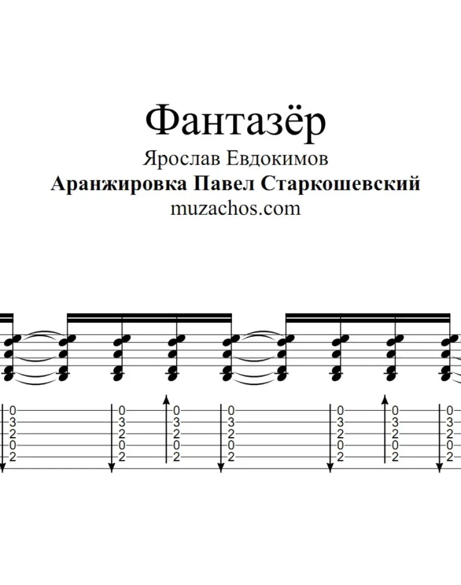 Ноты для одной гитары с аппликатурой левой руки и табы к переложению песни в исполнении Ярослава Евдокимова «Фантазёр».