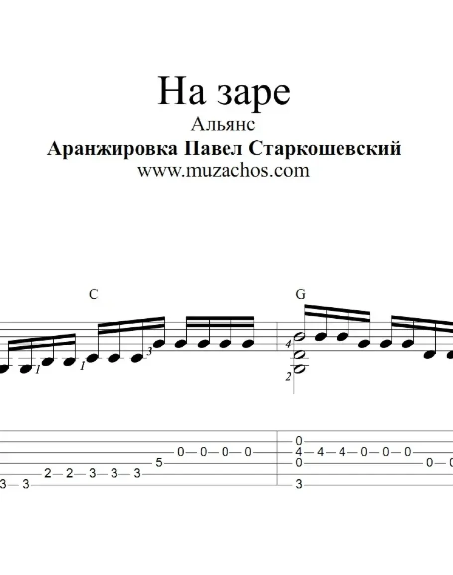 Ноты для одной гитары с аппликатурой левой руки и табулатура к переложению песни группы Альянс "На заре". Форматы: pdf, guitar pro 6
