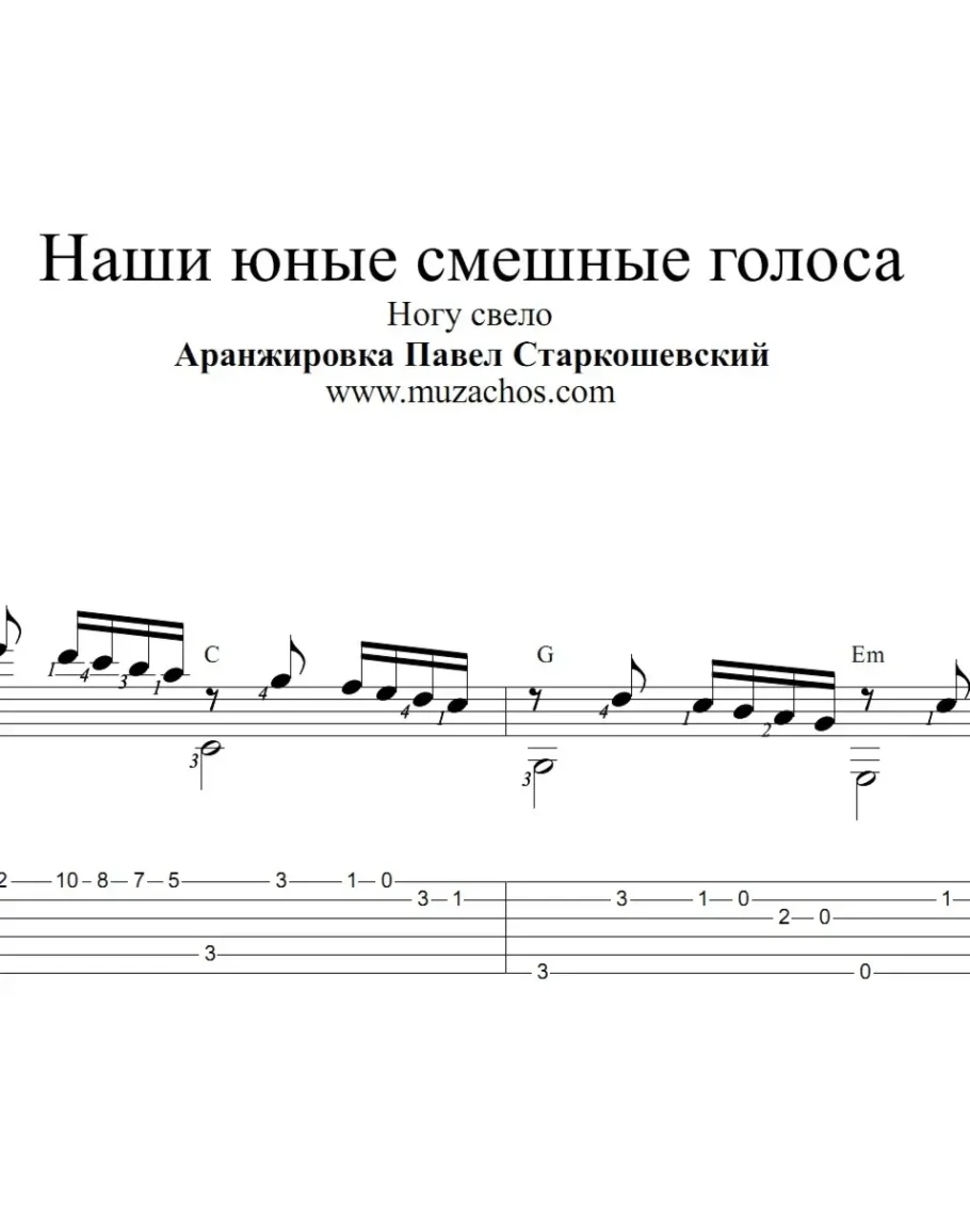 Ноты для одной гитары с аппликатурой левой руки и табулатура к переложению песни "Наши юные смешные голоса" (Ногу свело). Форматы: pdf, guitar pro 6