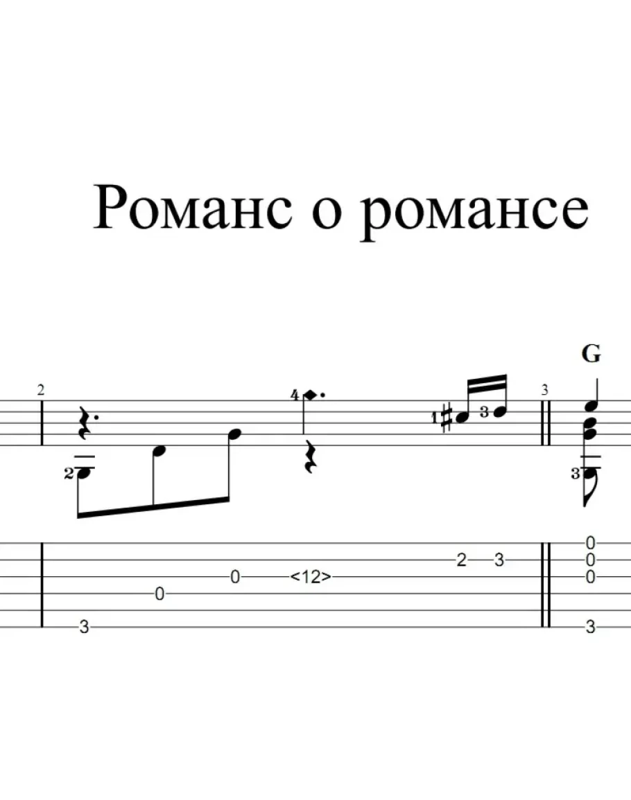 Ноты для одной гитары с аппликатурой левой руки и табулатура к переложению песни "Романс о романсе" (из к/ф "Жестокий романс"). Форматы: pdf, guitar pro 6 и 7