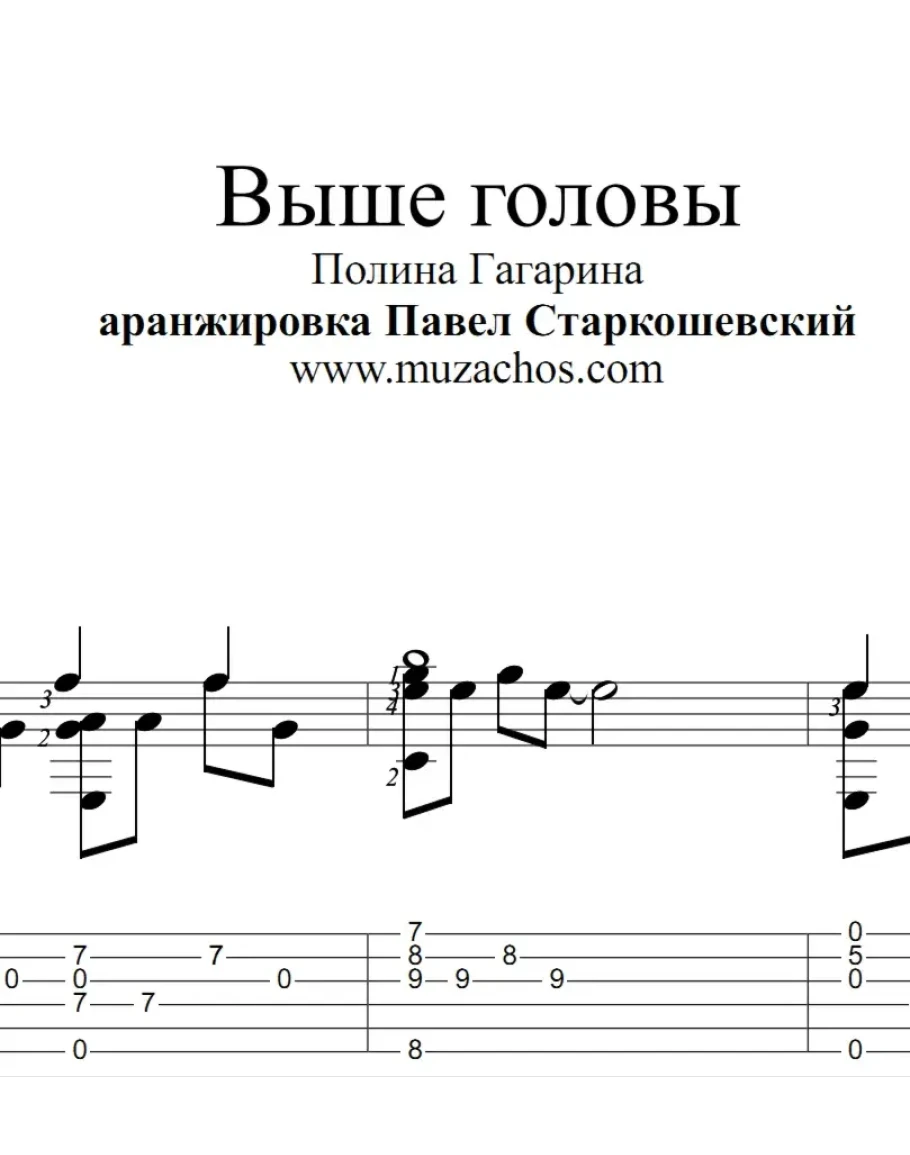 Ноты для одной гитары с аппликатурой левой руки и табулатура к переложению песни Полины Гагариной "Выше головы" Форматы: pdf, guitar pro 6