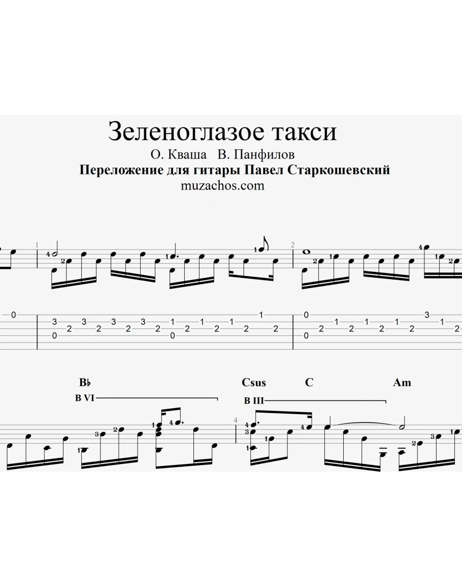 Ноты для одной гитары с аппликатурой левой руки и табулатура к переложению песни М. Боярский — Зеленоглазое такси (Новая версия) . Форматы: pdf, guitar pro 6 и 7.