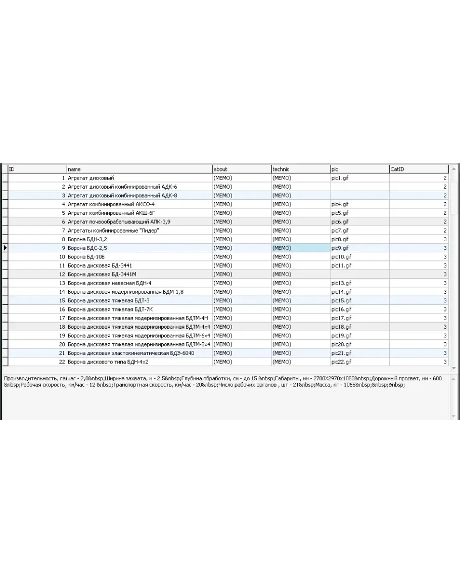 База содержит описания различных агрегатов (Бороны, Ботвоуборочные машины, Ворошилки, Жатки,Агрегаты для почвообработки) в 35 категориях, с их описанием и изображением (рисунки чистые, без водяных знаков), а также таблицу со статьями о разведение домашнего скота.