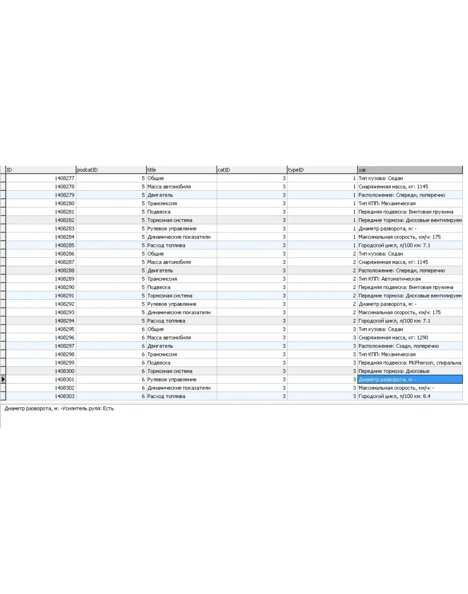 Готовая MySQL база данных для сайта с характеристиками автомобилей, разделённых на марки, модели и версии моделей. Для каждой модели блоки с описаниями технических характеристик машин. Описаны практически все выпускавшиеся когда-либо легковые автомобили. Всего 118 марок, 3414 модели и 19106 конкретных версий автомобилей, для которых есть изображение без ватермарок.