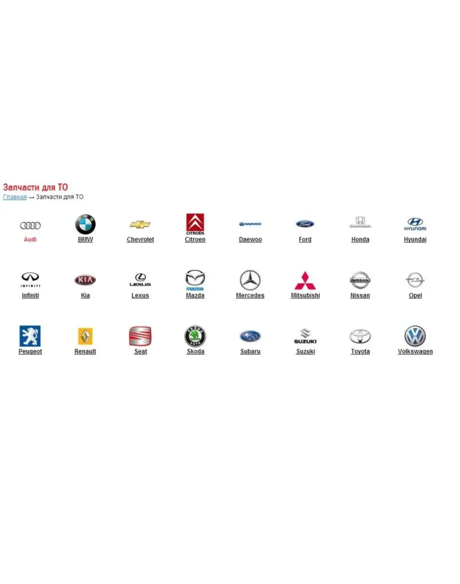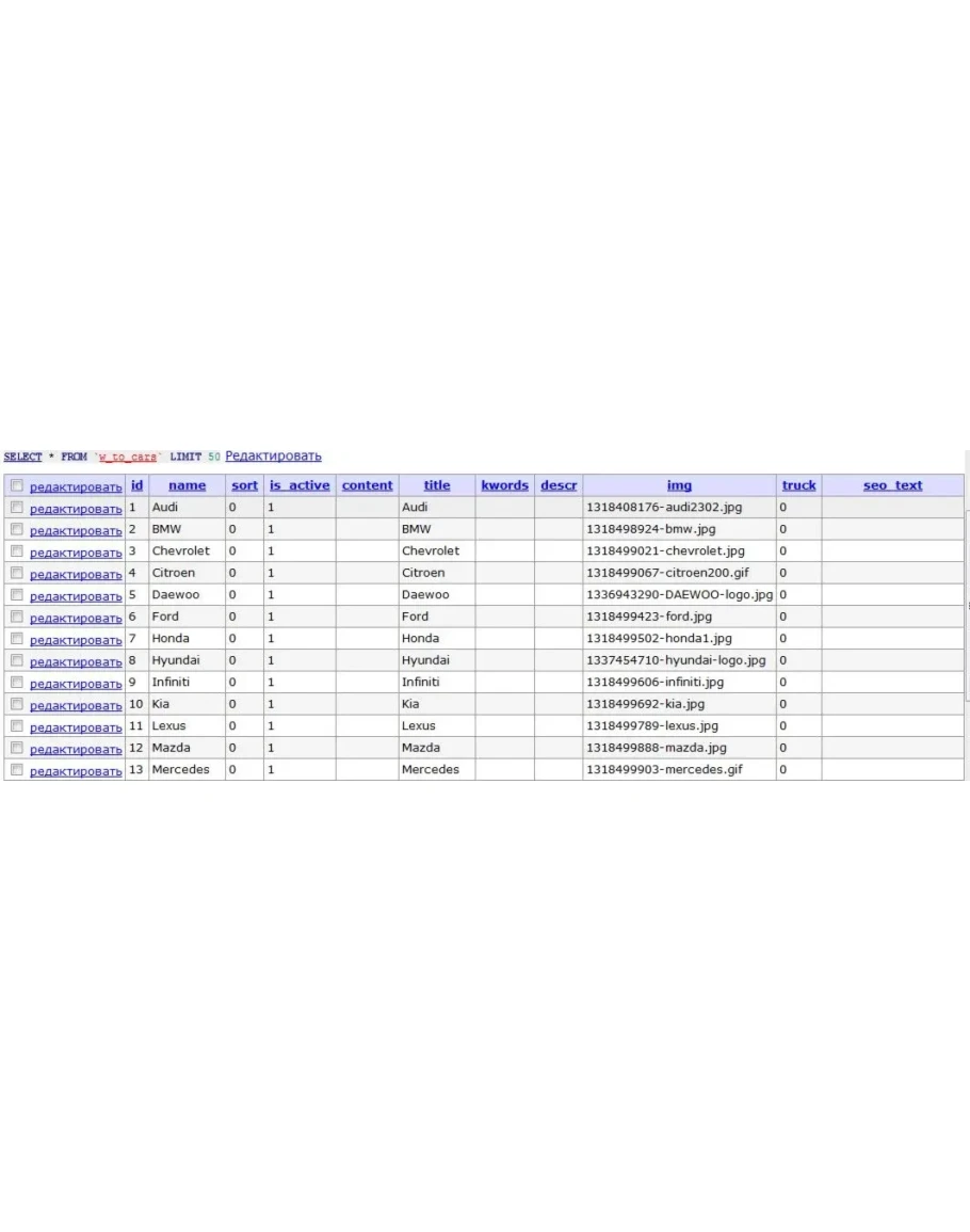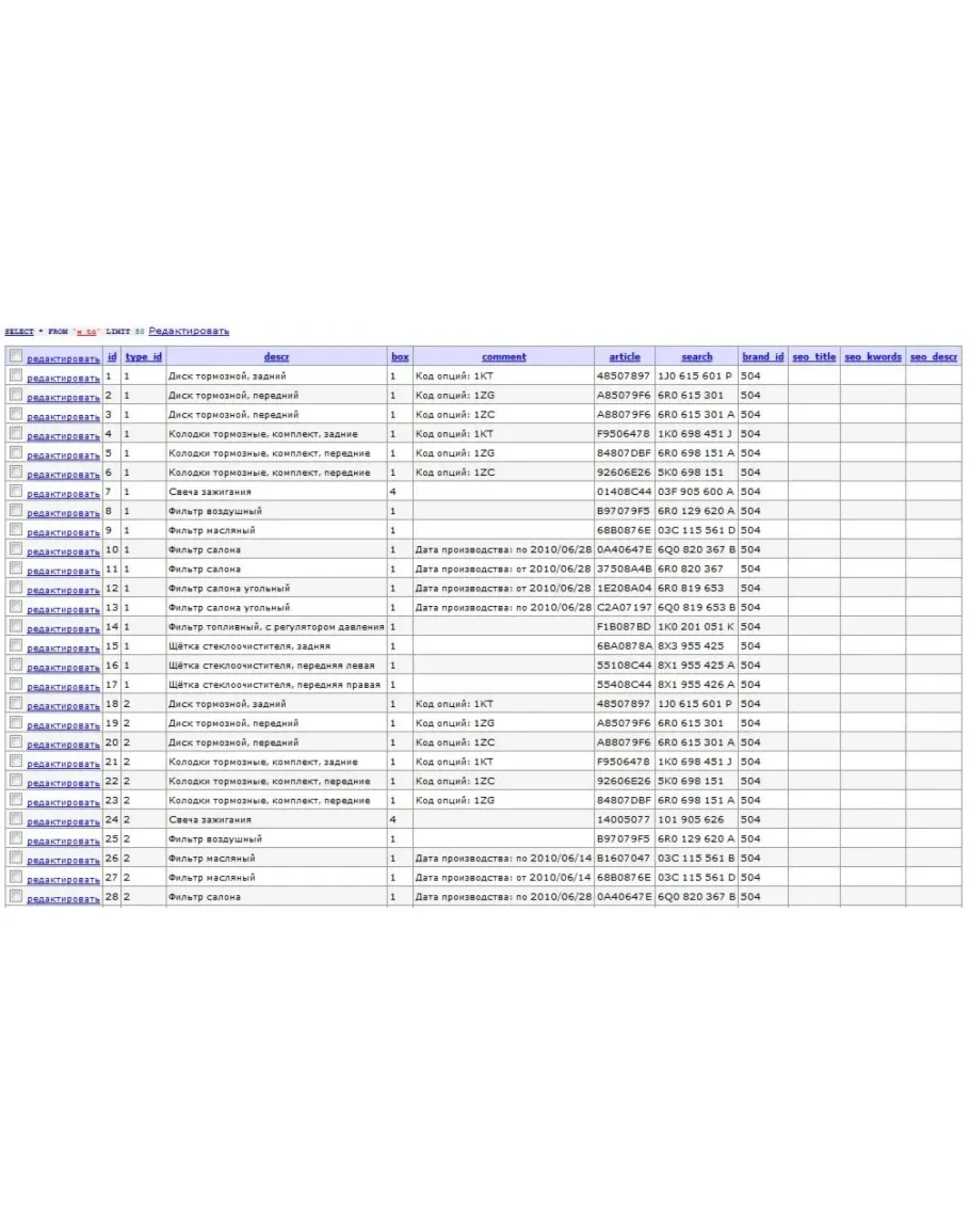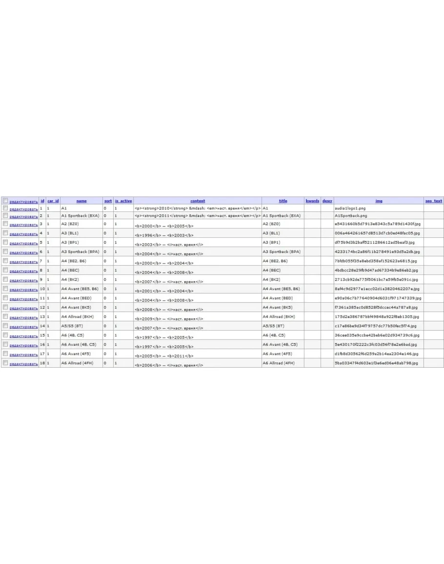 Готовая MySQL база данных запчастей автомобилей (обновлена 06.2015), позволяет сделать подбор запчастей для авто до 2015 г.в. Всего 50775 запчастей для 4126 модификаций авто. С помощью данной базы Вы сможете организовать у себя на сайте каталог расходных материалов с помощью которого можно будет подобрать запчасти для регулярного техобслуживания автомобиля, номера запчастей оригинальные, получены из каталогов производителей. База содержит 4 таблицы для организации каталога, а так же изображения логотипов марок и фото машин.