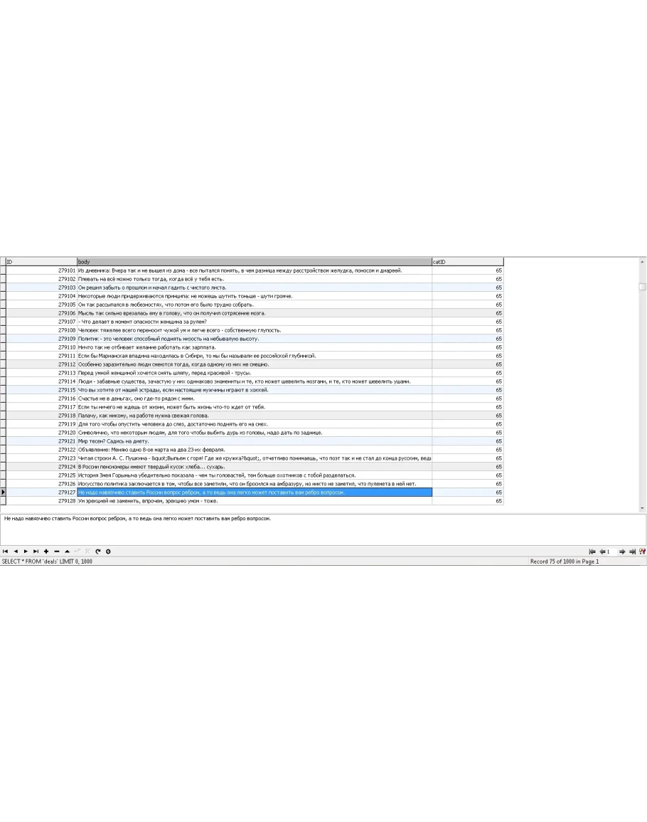 База данных афоризмов от известных людей и по тематическим категориям в MySQL, состоящая из 2381 записей в 65 категориях. Объём дампа базы, 672 кб.