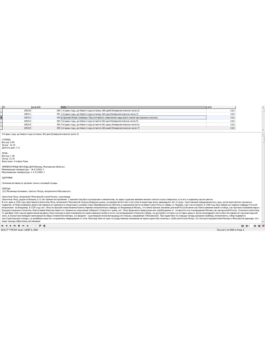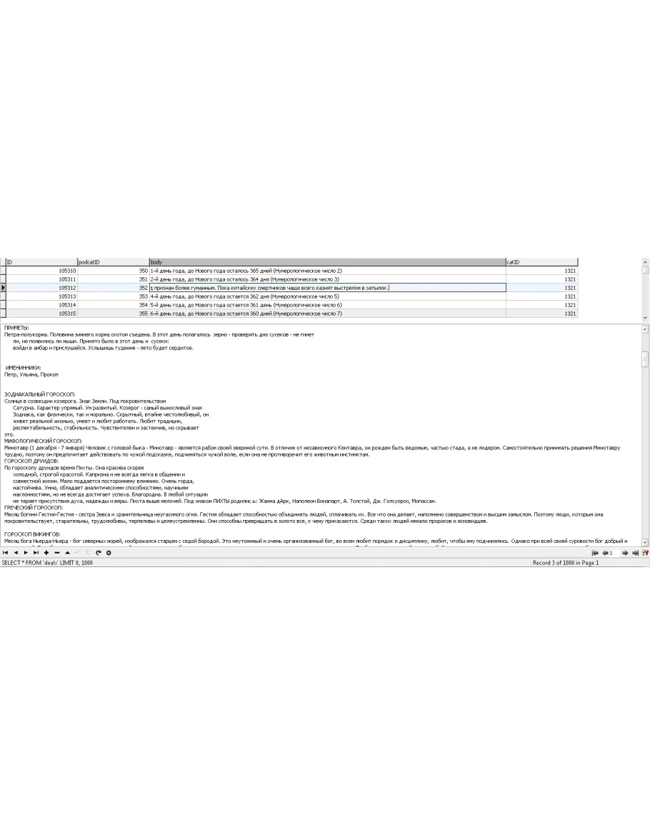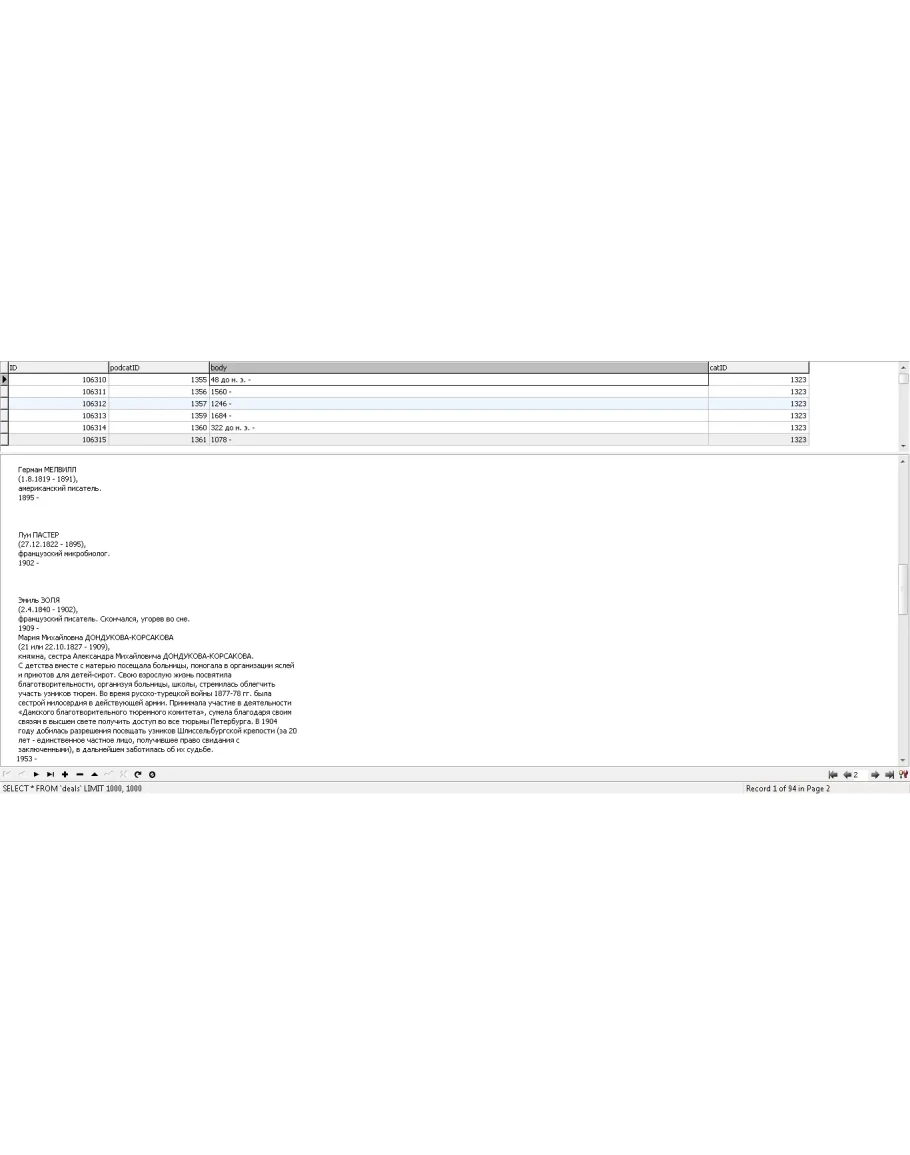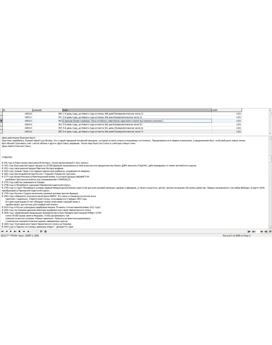 База данных описаний исторических событий по каждой дате в году в MySQL. В базе три категории (Родились в этот день, Умерли в этот день и Этот день в истории), для каждой категории 365-364 дат, всего 1094 записей. Объём базы 30 мб.